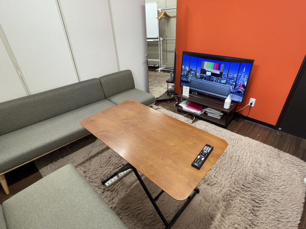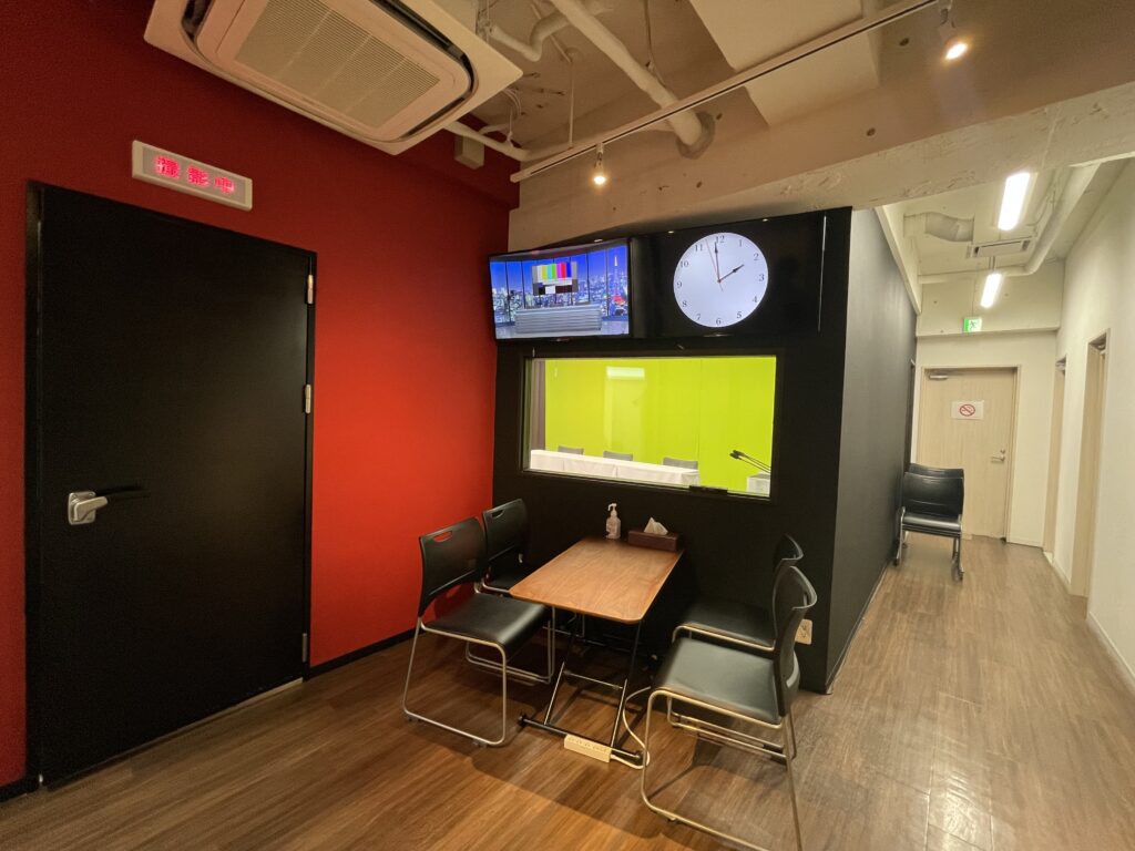 エントランス入ってすぐの多目的に使用できる会議エリアです。スタジオメインエリアと防音壁で隔てられているため、収録中でも打ち合わせしながら収録の様子を防音ペアガラス窓から確認ができます。