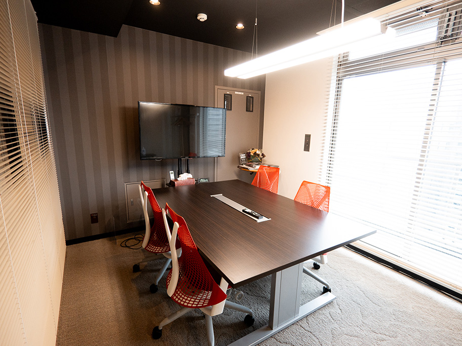明るい光の入る会議スペースです。最大5名まで収容でき、モニターで収録状況を確認しながら会議を進めることができます。